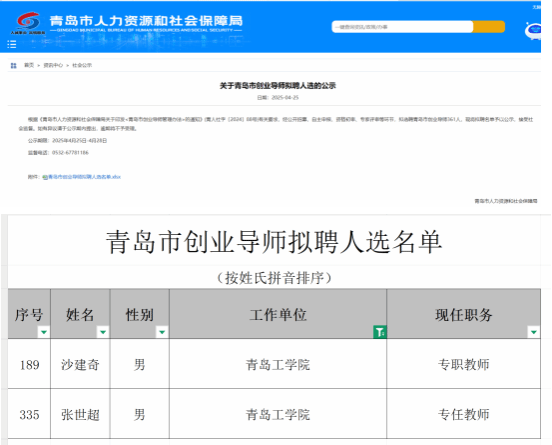 近日,青岛市人力资源和社会保障局公布了青岛市创业导师拟聘人选名单,太阳成集团122ccvip张世超老师、沙建奇老师凭借丰富的创新创业指导经验和突出的育人成果成功入选!这一荣誉不仅是对两位老师个人能力的认可,更是对建筑工程学经理期以来重视创新创业教育、培养应用型人才的充分肯定。