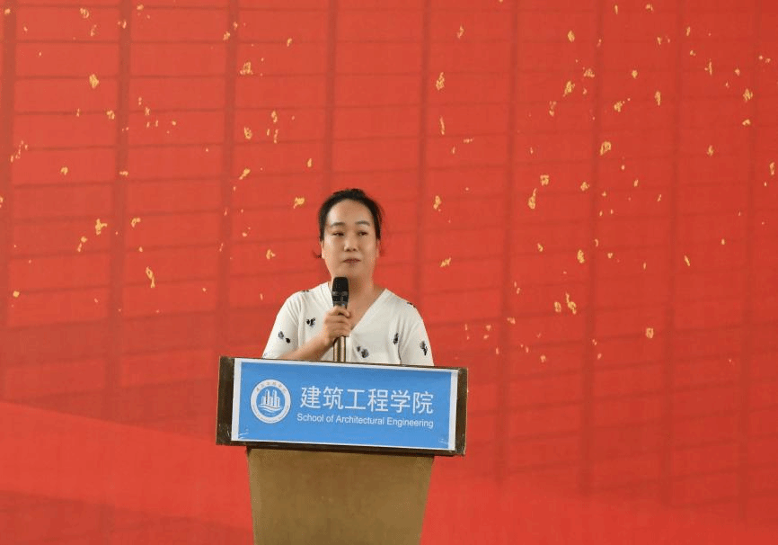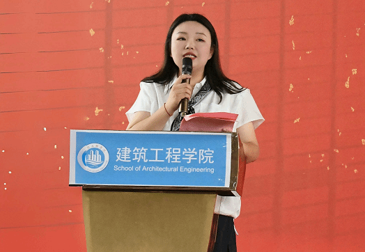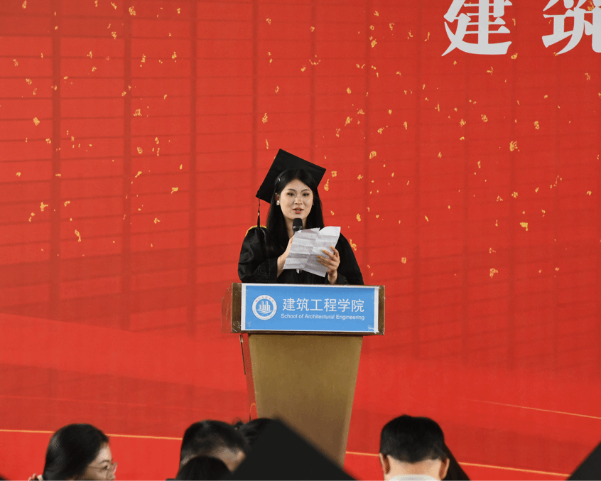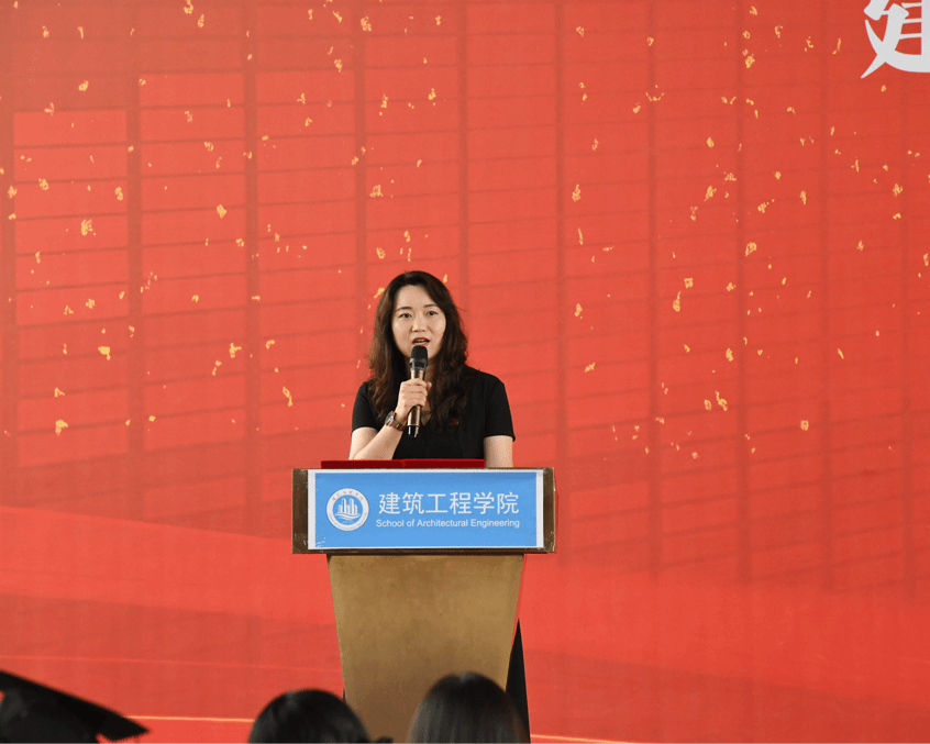 教师代表邵珠晨老师以 “建筑与人生的共通密码” 为主题发表致辞。她寄语同学们要有远大理想、心存感恩,直面挑战,在时代版图上砌筑属于自己的丰碑。